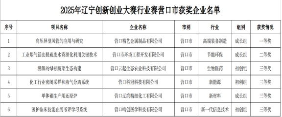 此次賽事中,營(yíng)口參賽企業(yè)聚焦細(xì)分領(lǐng)域深耕細(xì)作,多個(gè)項(xiàng)目憑借技術(shù)創(chuàng)新性、市場(chǎng)應(yīng)用價(jià)值及產(chǎn)業(yè)化前景獲得評(píng)委認(rèn)可。其中,營(yíng)口精藝金屬制品有限公司的“高壓異型風(fēng)管的應(yīng)用與研究”項(xiàng)目,特殊材質(zhì)滿足超低溫要求,適配高端裝備制造等特殊場(chǎng)景需求,填補(bǔ)國(guó)家空白;營(yíng)口市環(huán)境工程開發(fā)有限公司的“工業(yè)煙氣鎂法脫硫廢水資源化利用關(guān)鍵技術(shù)”,為環(huán)保領(lǐng)域破解廢水處理難題、實(shí)現(xiàn)資源循環(huán)提供新路徑;營(yíng)口云起生態(tài)農(nóng)業(yè)科技有限公司“溯源的綠標(biāo)蔬菜生態(tài)構(gòu)建”項(xiàng)目,搭建農(nóng)產(chǎn)品全鏈條質(zhì)量追溯體系,助力農(nóng)業(yè)高質(zhì)量發(fā)展;營(yíng)口鳴創(chuàng)醫(yī)學(xué)科技有限公司的“醫(yī)護(hù)臨床技能在線考評(píng)學(xué)習(xí)系統(tǒng)”項(xiàng)目,為醫(yī)療領(lǐng)域人才培養(yǎng)與技能考評(píng)提供數(shù)字化解決方案;營(yíng)口科冠科技有限公司“化工行業(yè)密閉采樣和液氣分離系統(tǒng)”、營(yíng)口遼濱精細(xì)化工有限公司“單體硼生產(chǎn)用還原爐”項(xiàng)目,則分別在化工安全升級(jí)、高端材料制造設(shè)備優(yōu)化上展現(xiàn)技術(shù)優(yōu)勢(shì)。