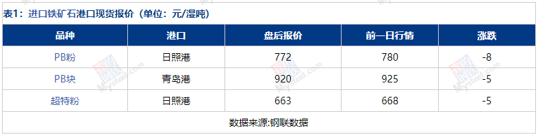 今日西南進(jìn)口鐵礦石現(xiàn)貨市場(chǎng)價(jià)格小幅下跌,今日暫無(wú)成交。具體來(lái)看,賣盤方面,行情影響下,今日貿(mào)易商報(bào)價(jià)積極性一般,報(bào)價(jià)隨行就市為主;買盤方面,鋼廠詢盤一般。鋼廠整體持觀望態(tài)度。表1:進(jìn)口鐵礦石港口現(xiàn)貨報(bào)價(jià)(單位:元/濕噸)