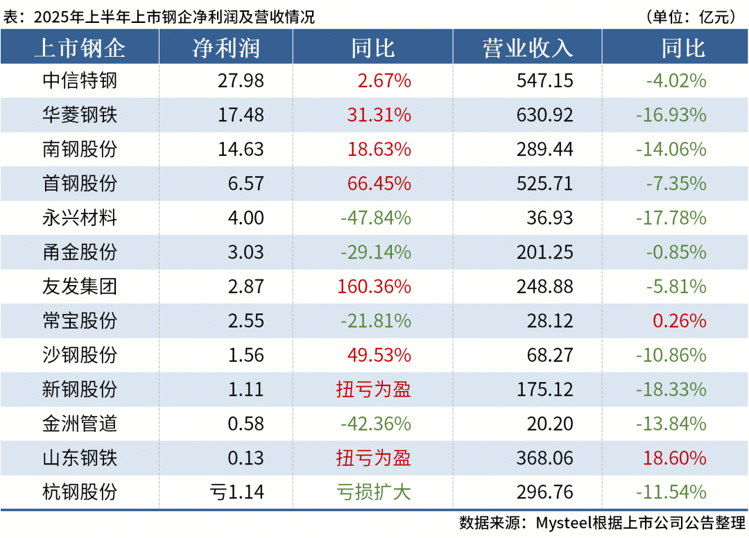 據(jù)統(tǒng)計(jì),截至8月25日,共有13家上市鋼企公布2025年上半年業(yè)績情況,合計(jì)營業(yè)收入3436.81億元,合計(jì)凈利潤81.35億元。